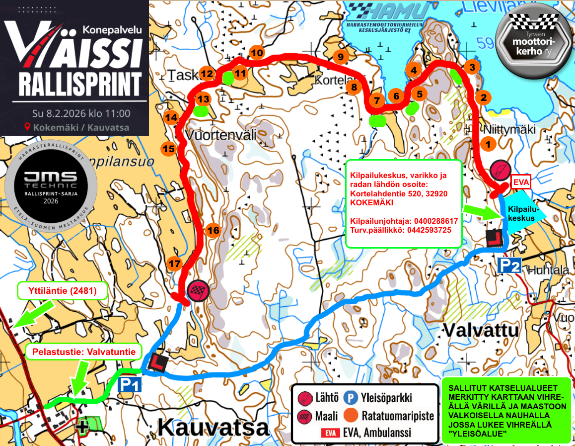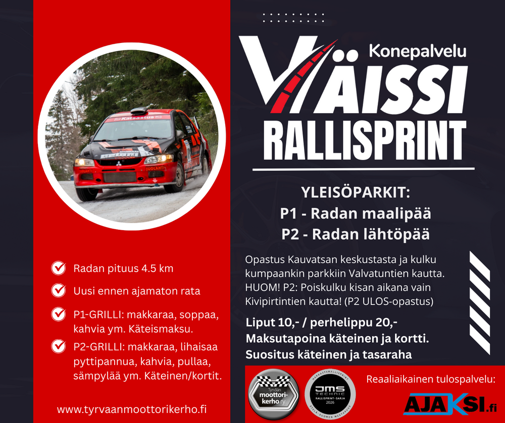 Kilpailijaohje: http://ajaksi.fi/wp/wp-content/uploads/2025/12/Kilpailijaohje_Konepalvelu_Vaissi_Rallisprint_08_02_2026.pdf