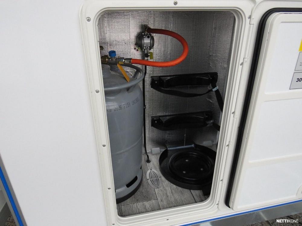 Ilmalämmitys kaasulla, sähköinen lattialämmitys, WC, suihku, jääkaappi ym.