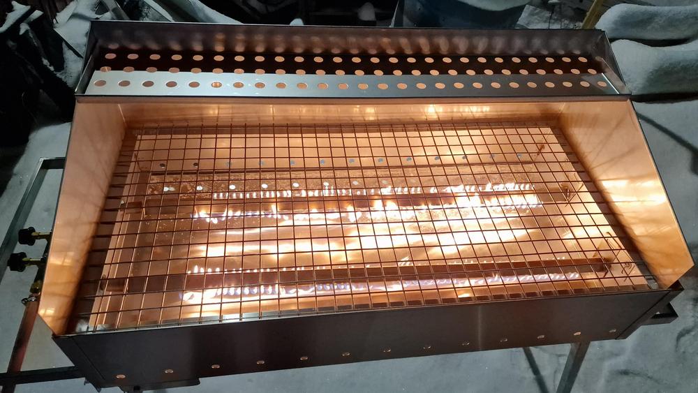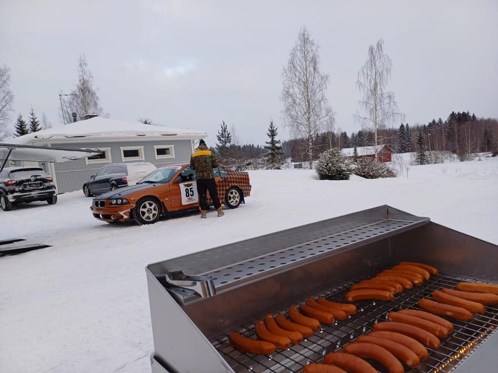 MAKKARAGRILLI, ISO ROSTERINEN KAHDELLA POLTTIMELLA, LÄMPIMÄNÄPITOTASOLLA JA TUULISUOJALLA, MAHTUU NOIN 100 MAKKARAA KERRALLA